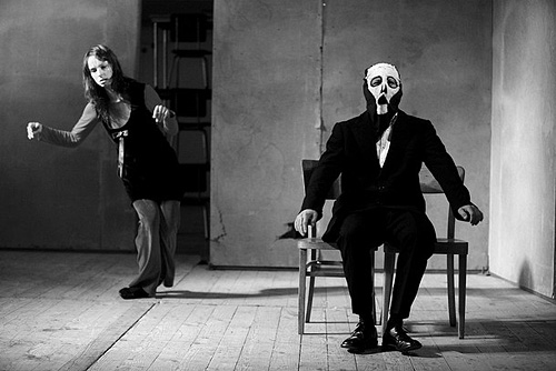 Przytułek. Grupa pensjonariuszy wystawia spektakl w oparciu o rytuał tańca śmierci.